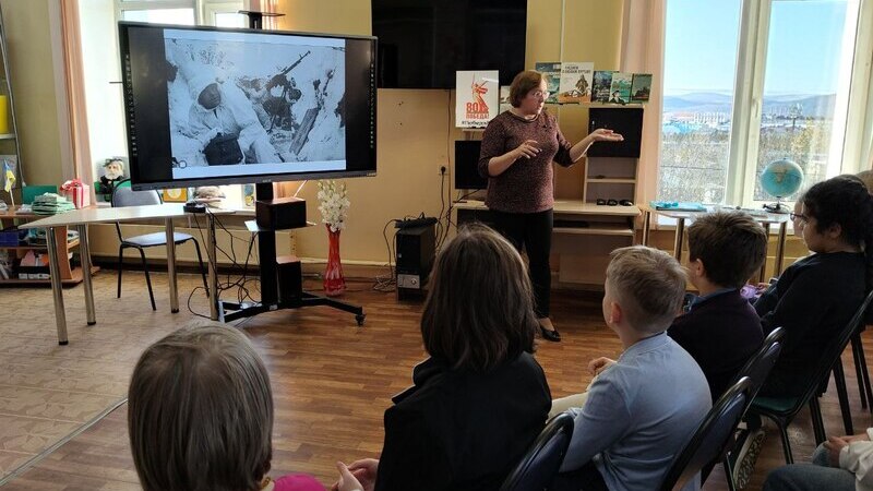 Вначале встречи сотрудники библиотеки рассказали о событиях военных лет, когда враг пытался прорваться через границу советского Заполярья. Ребята узнали об исторических событиях обороны стратегически важного Кольского полуострова и увидели архивные фотографии. Особое внимание было уделено героям, воевавшим на Кольской земле: смелости и бесстрашию морского пехотинца Василия Кислякова, командиру разведывательно-диверсионного отряда Виктора Леонова. Вспомнили о героическом подвиге нашего земляка Анатолия Бредова и восхитились отвагой полярных летчиков Бориса Сафонова и Захара Сорокина, совершавших смертельно опасные вылеты в защиту родных берегов. Школьникам был показан анимационный фильм о подвиге юнги Саши Ковалева, а дошкольники посмотрели мультфильм «Солдатская сказка». Час истории в центре краеведения и страноведения посетили воспитанники подготовительной группы ДОУ №93, третьеклассники гимназии №5 и школы №45 и ученики 4Б класса гимназии №3. Такие встречи помогают юным мурманчанам лучше узнать историю родного края, воспитать чувство патриотизма, а также сохранить историческую память поколений. |