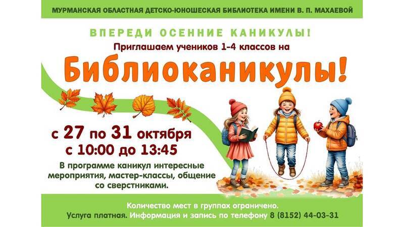 Библиоканикулы: яркая осень в компании книг и друзей!Мурманская областная детско-юношеская библиотека имени В. П. Махаевой приглашает учащихся 1-4 классов провести время с пользой и удовольствием на Библиоканикулах!25 октября 2025Осенние каникулы – это прекрасная возможность отдохнуть от учебы, набраться сил и заняться чем-нибудь интересным. Библиотека приглашает учащихся 1-4 классов провести время с пользой и удовольствием на Библиоканикулах! С понедельника по пятницу с 10:00 до 13:45 в библиотеке ребят ждет увлекательная программа, разработанная опытными специалистами. Библиоканикулы – это не только развлечение, но и прекрасная возможность: